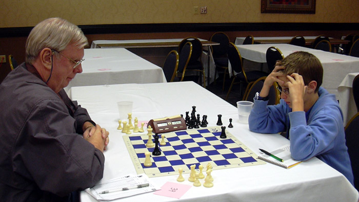 | Jacob Parrish (right) notched a key win over NM Klaus Pohl of South Carolina in Round 3 |