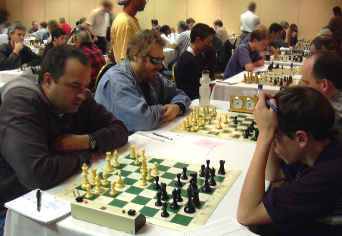 | NM Chris Mabe (left) battles FM Ron Simpson; at the next board, FM Miles Ardaman takes on NM Neal Harris |